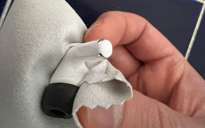 - کنتاکتهای فلزی نقرهای رنگ در انتهای ساقه هر ایرپاد را با یک پارچه میکروفایبر نرم و خشک به دقت تمیز کنید.