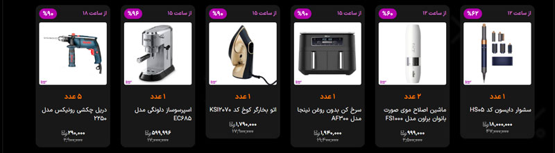 - تا ۶۰٪ تخفیف روی انواع لوازم خانگی برقی شامل سرخکن، جاروبرقی، اسپرسوساز و…