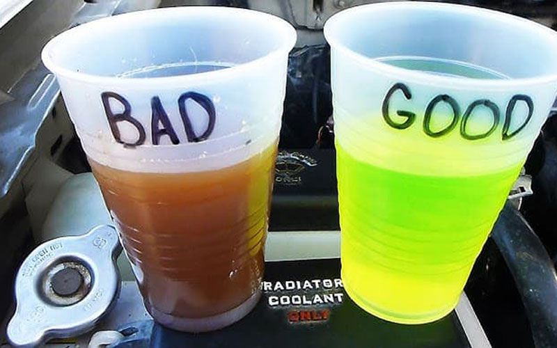 - تغییر رنگ: اگر رنگ مایع از حالت شفاف (سبز، قرمز یا آبی) به رنگ قهوهای، زنگزده یا شیری تغییر کرده باشد.