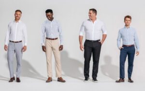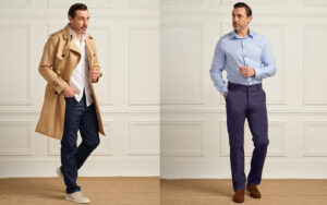 شلوارهای چاینو استایل و کتان از شلوار مردانه در رنگهای خنثی مانند خاکستری، سرمهای و بژ، گزینههای مناسبی برای تیپ کلاسیک مردانه هستند. همچنین شلوار جین راسته برای استایلهای اسپرت که با کت تک پشمی یا کتان ست میشود. قد شلوار در استایل کلاسیک نباید کوتاه باشد.