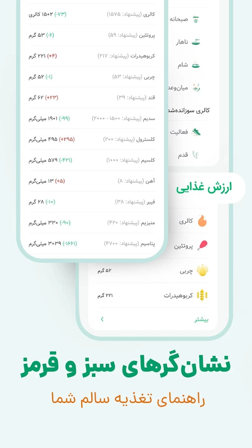 - ریزمغذیها: ویتامینها و مواد معدنی مانند آهن، کلسیم، سدیم و فیبر. ردیابی این موارد به شما کمک میکند تا از کامل و متعادل بودن رژیم غذایی خود اطمینان حاصل کنید.