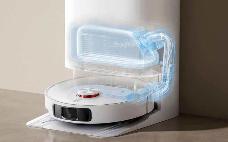 - ایستگاه شستشو و خشککن (All-in-One Station): این ایستگاههای پیشرفته علاوه بر تخلیه گرد و غبار، پدهای تی کشی را با آب تمیز شستشو داده، با هوای گرم خشک میکنند تا از ایجاد بوی نامطبوع و رشد باکتری جلوگیری شود و مخزن آب دستگاه را نیز پر میکنند.