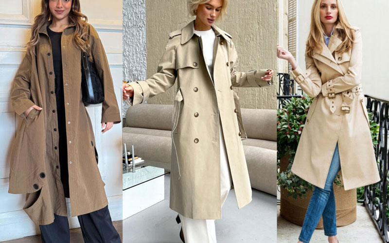 ترنچ کت، یک مدل جاودانه و همهکاره است که از لباسهای نظامی الهام گرفته شده و امروزه به یکی از اصلیترین اجزای کمد لباس بانوان تبدیل شده است. ویژگیهای شاخص آن شامل یقههای بزرگ، کمربند و طراحی دو ردیف دکمه است. ترنچ کتها معمولاً از پارچههای ضدآب یا کتان ضخیم تهیه میشوند و برای فصول پاییز و بهار یا روزهای نهچندان سرد زمستان، گزینهای ایدهآل به شمار میروند.