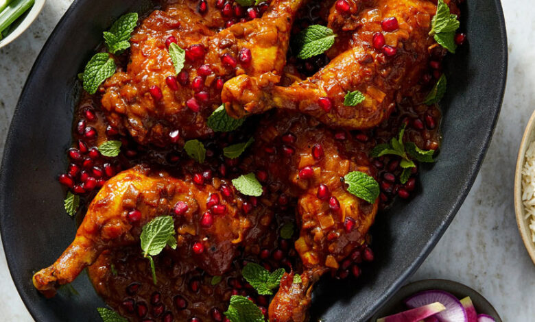 مرغ را با زعفران و کره طلایی کنید و در کنار آن سسی از رب انار و کمی شکر آماده کنید. ترکیب زرد و قرمز کاملاً یلدایی و زیباست.